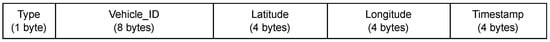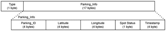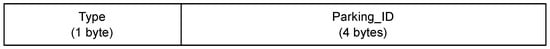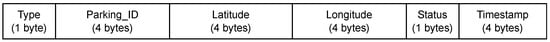 Moreover, we introduced a (5) HeartBeat packet having the same structure of the SensorUpdate packet (see Figure 5) with the aim of maintaining the presence and current status of the parking sensors at regular intervals. The type of the message is 0x05, and it is essential to allow the gateway to use these signals to verify the ongoing activity of each node. If no heartbeat is received from a specific parking spot for a specified duration, the corresponding entry is removed or flagged as inactive from the gateway’s internal parking list.