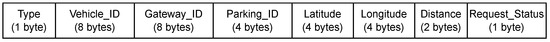 A (1) ParkRequest Packet (Figure 2) is sent by any vehicle to request a parking spot lookup, which is handled by gateways. It includes several pieces of information: the vehicle identifier; the timestamp of the request; and optionally, GPS coordinates encoded in fixed-point integer format, limited to the seventh decimal unit, to achieve centimetre-level spatial precision while optimising memory usage and bandwidth. The message is sent to all the gateways within range that maintain a list of available parking spots and process the request.