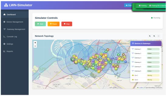 In particular, the simulated urban area was mapped to approximate the density and distribution of parking infrastructure and traffic flow typical of Dubai’s city centre. Dubai was selected as the simulation environment due to its representative characteristics of modern smart cities, including high vehicle density (540 vehicles per 1000 residents), mixed-use urban planning combining commercial and residential areas, and ongoing smart city infrastructure investments. Dubai’s parking demand patterns, with approximately 30% of urban traffic attributed to parking search activities, align with the global urban parking challenge that ChirpPark aims to address. Gateways were strategically placed to maximise coverage and minimise communication dead zones, while vehicles were programmed to exhibit realistic arrival, parking, and departure patterns based on empirical urban mobility models. Each parking spot was equipped with a virtual sensor capable of periodic status updates and event-driven changes. The graphical dashboard of the simulator showing the specific simulation is shown in Figure 7.