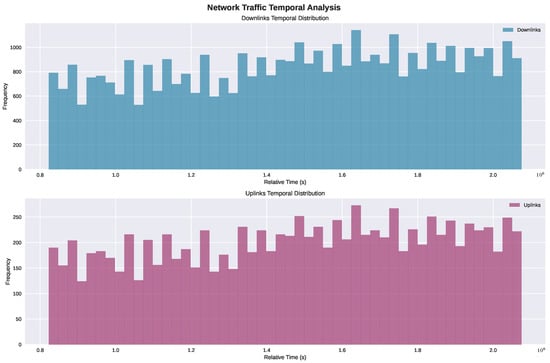 - Total Downlinks/Uplinks: This counts all LoRaWAN messages exchanged. Indeed, 22,878 were sent from the gateway (downlinks) and 10,752 were sent by the nodes (uplinks). In short, it is the total radio chatter. This aspect is highlighted in Figure 8, where the temporal distributions of both downlink and uplink messages are shown. The histograms provide a visual confirmation of the volume discrepancy between downlinks and uplinks across time.