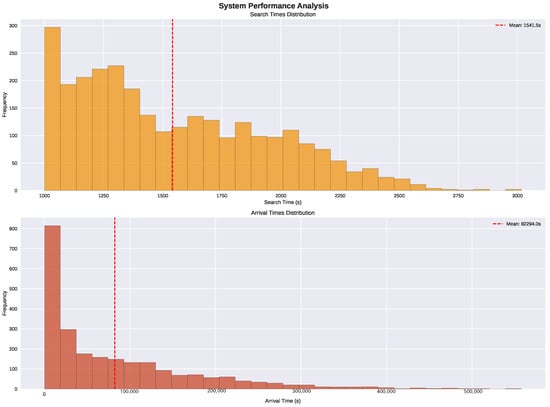 The histogram in Figure 10 (top panel) shows how parking request frequency peaks at the beginning of the simulation and quickly declines as vehicles gradually secure a space, confirming the expected self-throttling behaviour of the protocol.