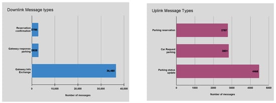Energy consumption analysis indicated that parking sensors could operate for over 18 months on a standard 2400 mAh battery, assuming a 15 min heartbeat and event-driven transmissions. The protocol’s emphasis on minimising unnecessary communication proved effective in extending sensor lifespan. Moreover, Figure 11 also reveals that 36,480 gateway-info-exchange messages were routed among gateways during the run, highlighting the overhead required to maintain a globally consistent view of parking spot occupancy.