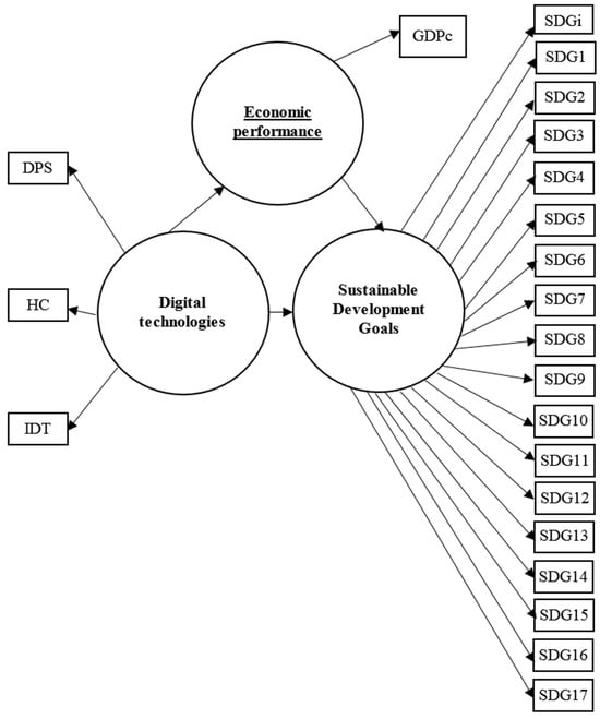 The study uses SEM to examine the impact of emerging digital technologies on SDG progress in European Union countries. SEM allows for the simultaneous evaluation of direct and indirect relationships between digital technologies, economic performance, and SDG progress. This method combines factor analysis and regression analysis [], providing a detailed perspective on how components of DESI influence SDG progress.