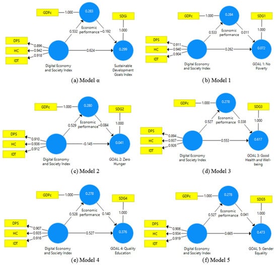 The two hypotheses were tested using SEM with SmartPLS v3.0 software, known for its flexibility in analyzing complex data and handling models with multiple causal relationships []. Using this software, we assessed digitalization’s direct and indirect impact on SDGs in EU countries. SEM also enabled us to identify the mediation effects of economic performance, represented by GDP per capita. Figure 2 shows the α model, illustrating the direct and indirect influences of selected DESI components on the SDG index (SDGi), along with models 1–5, showing the direct and indirect influences of the DESI components on the first five indices associated with the first five goals (SDG1–SDG5). The DESI components are reflexive to the Digital Economy and Society Index latent variable []. Other latent variables, such as Economic Performance; Sustainable Development Goals Index; GOAL 1: No Poverty; GOAL 2: Zero Hunger; GOAL 3: Good Health and Well-being; GOAL 4: Quality Education; and GOAL 5: Gender Equality, each have an observable variable (GDP per capita, the aggregate SDG index, and the indices for the first five goals).