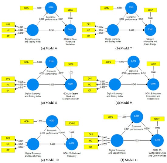 Figure 3 presents models 6–11 illustrating the DESI components’ direct and indirect influences on the indices associated with SDG goals 6–11. DESI components have a reflexive relationship with the latent variable []. Other latent variables, such as Economic performance, GOAL 6: Clean Water and Sanitation, GOAL 7: Affordable and Clean Energy, GOAL 8: Decent Work and Economic Growth, GOAL 9: Industry, Innovation and Infrastructure, GOAL 10: Reduced Inequality, GOAL 11: Sustainable Cities and Communities, each have an observable variable (GDP per capita and indices for SDG goals 6–11).