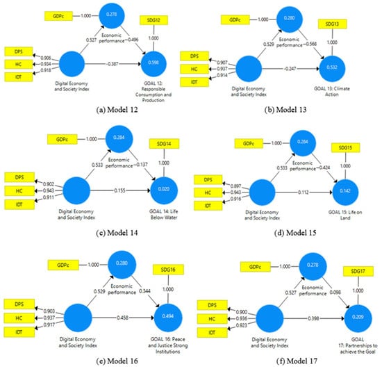 Figure 4 describes models 12–17, illustrating the DESI components’ direct and indirect influences on the indices associated with SDG12–SDG17. The DESI components exhibit a reflexive relationship with the latent variable. The other latent variables—Economic Performance, GOAL 12: Responsible Consumption and Production, GOAL 13: Climate Action, GOAL 14: Life Below Water, GOAL 15: Life on Land, GOAL 16: Peace and Justice Strong Institutions, GOAL 17: Partnerships to achieve the Goal—each have an observable variable (GDP per capita and the indices for the SDG12–SDG17 goals).