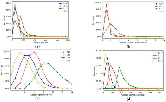 We classified the most stable trucks in terms of their operational patterns based on six indicators: turning radius, number of route cities, average operating hours, average operating mileage, operating days, and average number of consecutive operating days. According to Figure 4, the number of clusters was set to four. Consequently, the trucks were grouped into four categories, labeled as C10, C11, C12, and C13.