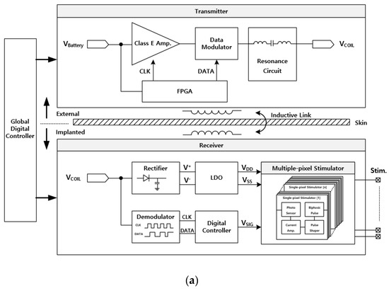 Figure 1a presents the architecture of the 256-pixel subretinal implant system, which is divided into two main components: the transmitter and the receiver. The transmitter in this study consists of a Class-E amplifier and a field-programmable gate array (FPGA). The FPGA generates 32-bit data packets at a rate of 20 kbps, with a clock frequency of 2 MHz. The 20 kbps data are modulated with the 2 MHz signal using an amplitude-shift keying (ASK) modulation scheme, and the resulting modulated waveform serves as the input to the Class-E amplifier, where it is utilized as the carrier frequency. The output signal from the Class-E amplifier is wirelessly transmitted to the implantable device via inductively coupled coils.