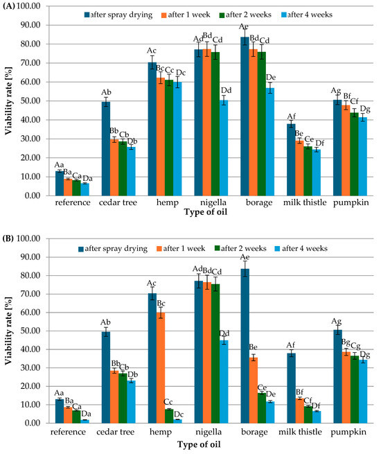 A relatively high viability rate of bacteria was also observed for systems with hemp oil (especially after adding 20% oil), which contains alpha-linoleic acid and doesn’t contain oleic acid. Pumpkin oil has almost the same content of oleic acid and linoleic acid as that of milk thistle oil. Pumpkin oil hasn’t vitamin E (while milk thistle has 48 mg/100 g), however, presents a stronger protective effect in the case of 20% oil (51.64% vs. 37.91%). Pumpkin oil (without vitamin E and without γ-linolenic acid content) demonstrated a stronger protective effect compared to cedar tree oil, which has vitamin E and γ-linolenic acid in its composition (Table 2).