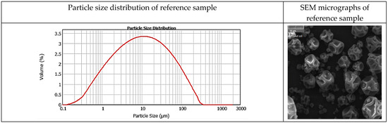 The particle size distribution of powders was measured using the particle size analyzer MasterSizer 2000 (Malvern Instruments, Malvern, UK) with a Scirocco 2000 dry sampling system (Malvern Instrument Ltd., Worcestershire, UK). All parameters were kept constant: refractive index: 1.52, vibration feed rate: 40–50%, measurement time: 15 s, 5 scans, dispersive air pressure: 4 bar. The size of particles was described as volume-weighted mean D4,3. The final values are the average of 3 measurements.