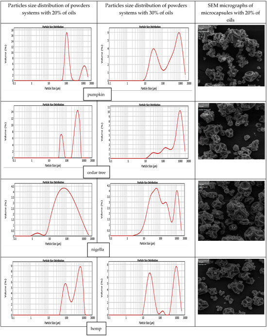Powder particles containing different oils had similar morphology, indicating that the type of oil had no effect on the appearance of the microcapsules. Most of the microcapsules were spherical in shape with dimpled surfaces and sizes in the range from 0.4 to 21 µm.