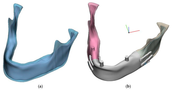 CAD parametric model of the mandible: (a) without implant, (b) with implant.