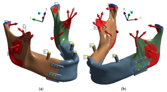 - Narra, N.; Valášek, J.; Hannula, M.; Marcián, P.; Sándor, G.K.; Hyttinen, J.; Wolff, J. Finite element analysis of customized reconstruction plates for mandibular continuity defect therapy. J. Biomech. 2014, 47, 264–268. [Google Scholar] [CrossRef]