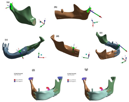 - The third variant assumed no osseointegration and connection exclusively through anchoring screws for a model supported in both joints (Figure 4g);
