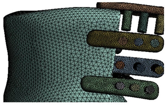To enhance FEM accuracy, local mesh refinement was introduced in high-stress regions. A minimum of two elements per section thickness is required for reliable FEM analysis; in this case, at least three finite elements per implant wall thickness and five per bone fixation plate thickness were achieved, ensuring an adequately refined mesh for precise results and accurate stress-strain calculations. The element statistics option in ANSYS was used to provide detailed information on the types of elements applied (Figure 5). The final implant mesh contained 531,644 nodes and 338,239 tetrahedral elements. A non-coherent mesh interface was used between the implant wall and bone fixation plates due to their complex geometry.
