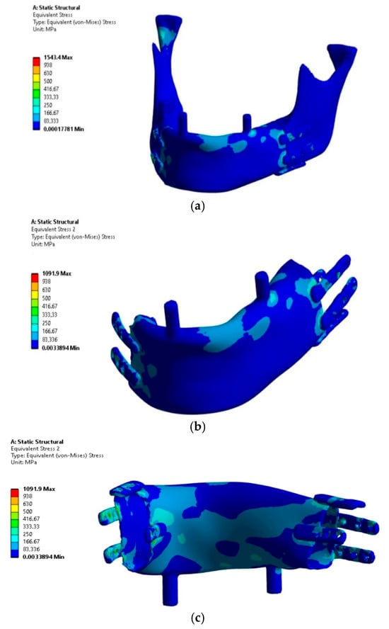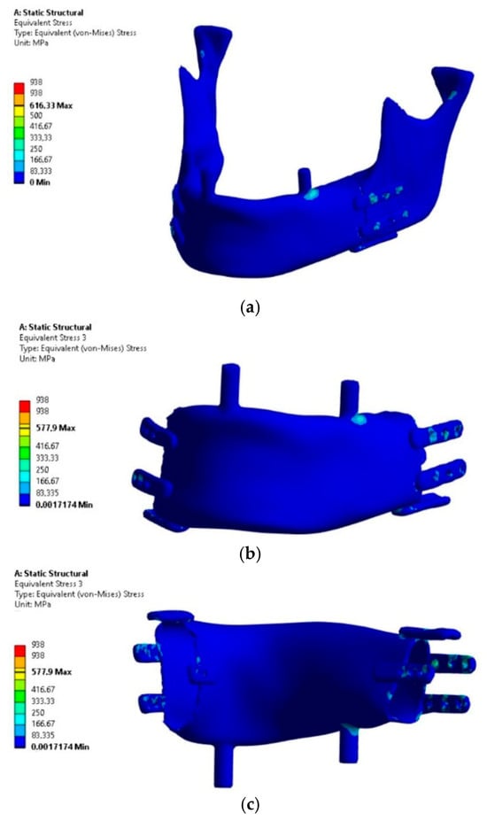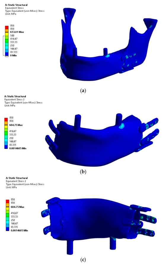 The analysis focused on the implant’s load-bearing capacity depending on the support conditions, while the stress results in bone tissue should be considered indicative due to the lack of mesh densification and reinforcement near the fixation plates. The results of the load-bearing capacity verification of the mandibular implant subjected to four load variants are presented in Figure 6, Figure 7, Figure 8 and Figure 9. The presentation includes Huber-Mises (H-M) equivalent stresses. A threshold value of 938 MPa was introduced in the stress scale, representing the strength of pure titanium [].