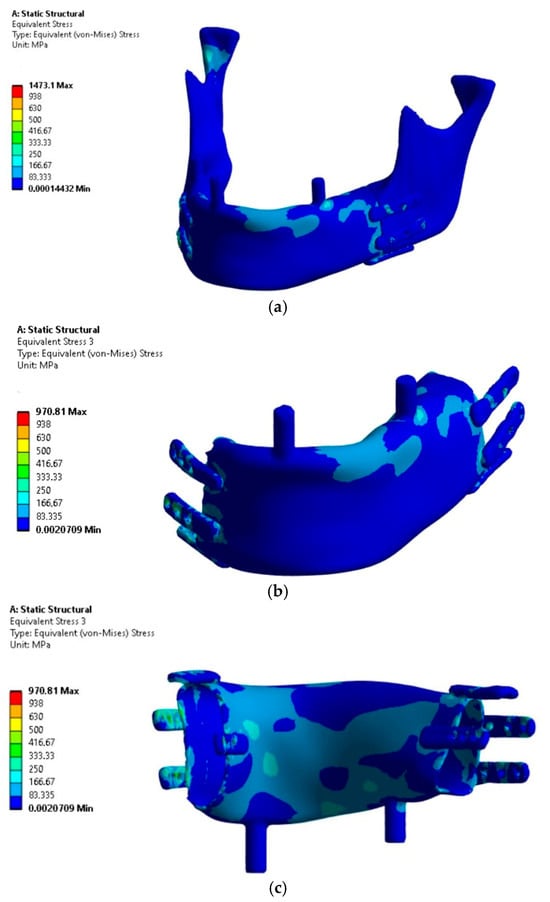 Simulation results for the model with full implant/bone osseointegration and support in both joints (Variant I): (a) Huber-Mises reduced stresses, (b) vestibular view with boundary condition, (c) lingual view with boundary condition.