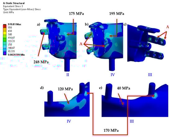 Comparison of stresses in the critical areas of bone fixation plates and the body of the implant. Artifacts in singular nodes are indicated by “A,” while the critical values are directly provided by the value readings. Variants: (a) II, (b) IV, (c) III, (d) IV, (e) III.