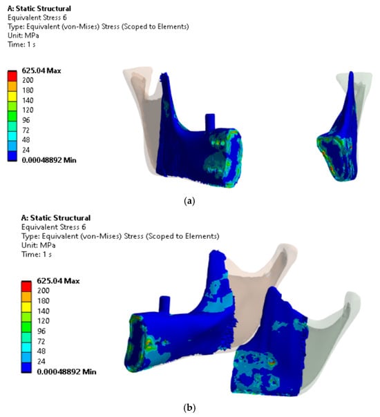 H-M reduced stresses in the mandibular bone tissue in the implant fixation area for Variant IV. (a) Results for the internal bone structure, (b) Results for the external bone structure.