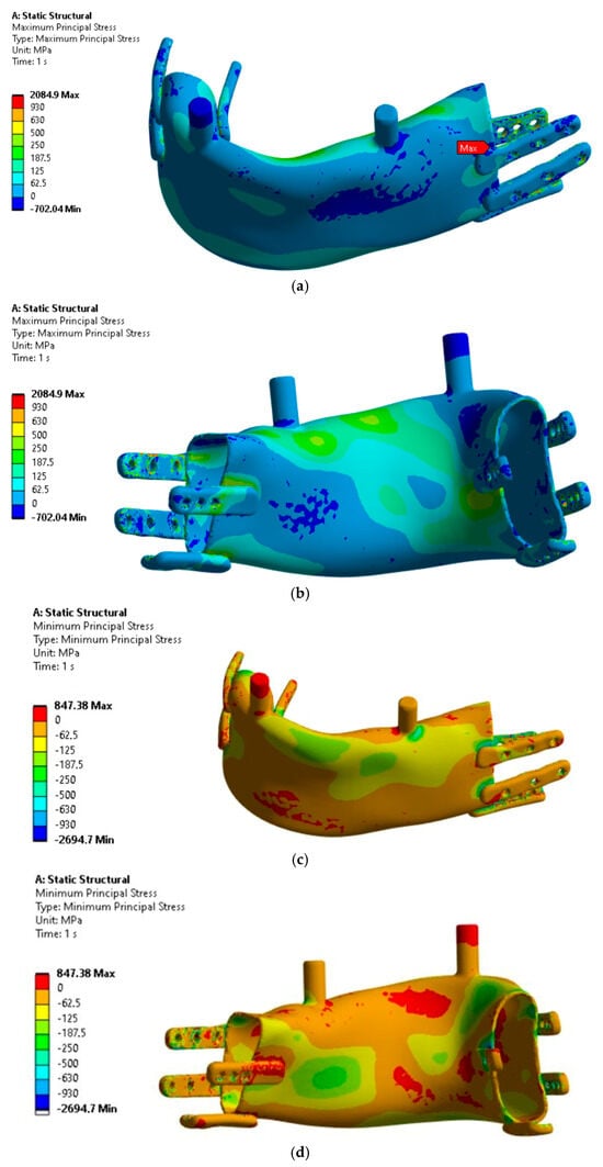 Principal stress results for the model supported on one side with contact disabled: (a) maximum principal stress (vestibular view), (b) maximum principal stress (lingual view), (c) minimum principal stress (vestibular view), (d) minimum principal stress (lingual view).