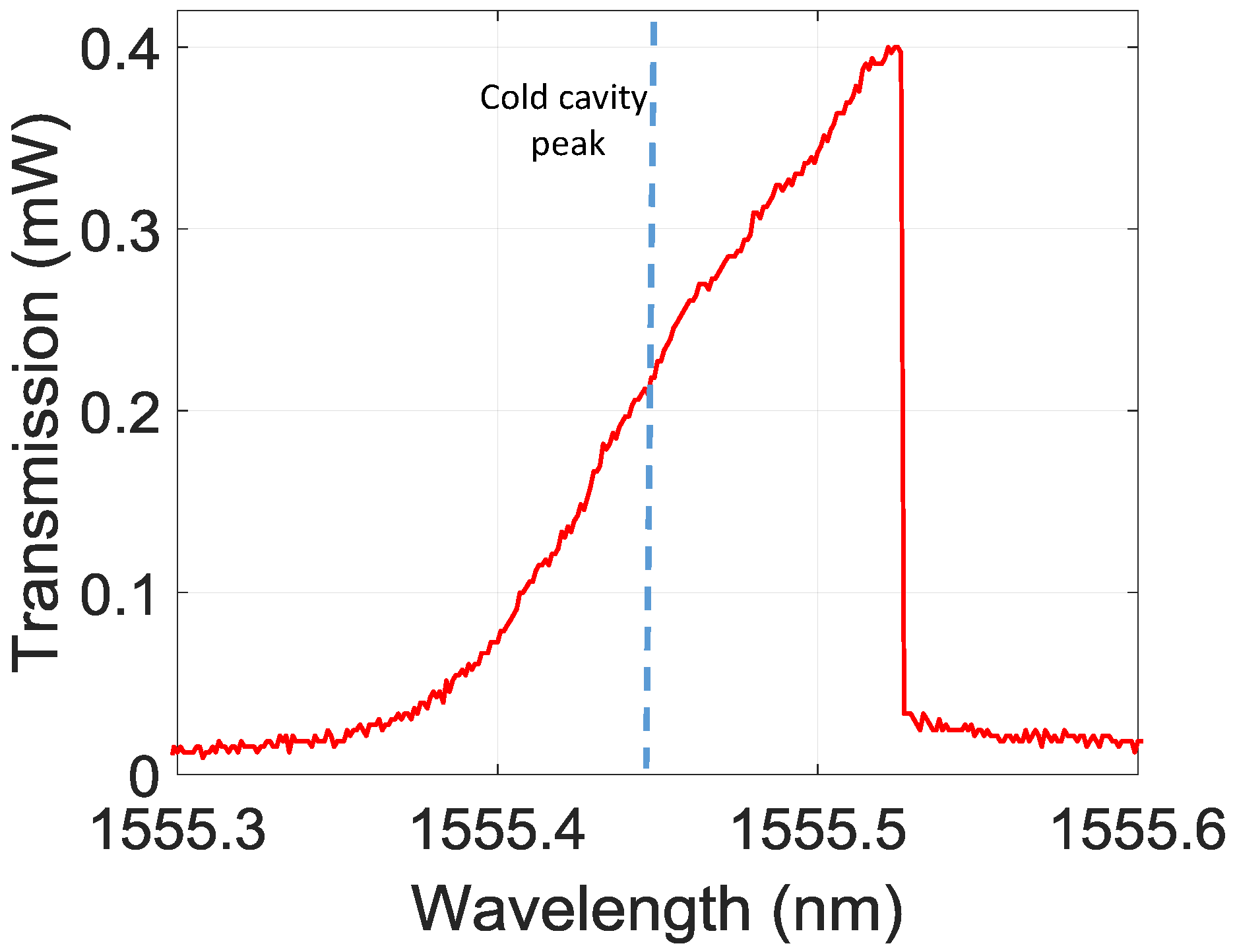 Typically, resonator-laser alignment is achieved at a given injection power by tuning the laser from the blue spectral side of the resonant line into the cavity. Gradually, the laser wavelength is increased, increasing the power in the cavity and therefore the thermally induced refractive index of the resonant line shift. The thermal refractive index increase shifts the resonant line to longer wavelengths as the laser wavelength approaches the cold cavity peak. Finally, at some detuning to the red side of the cold cavity peak, the thermally-induced refractive index shift is no longer sufficient to align the cavity resonance with the laser line and the system reverts to the cold cavity state. Figure 1 shows a typical measured transmission spectrum for a silicon waveguide resonator where the injected power is sufficient to induce a thermal refractive index effects. The device is a -phase shifted Bragg grating, the details of which will be discussed in Section 2.1.