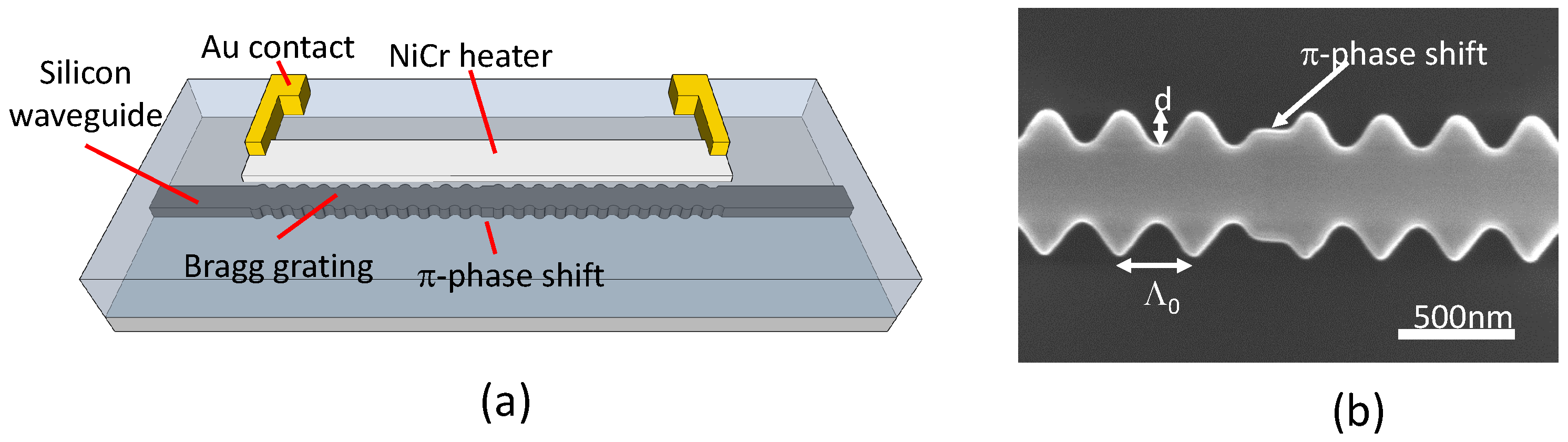 - Wang, X.; Shi, W.; Grist, S.; Yun, H.; Jaeger, N.A.F.; Chrostowski, L. Narrow-band transmission filter using phase-shifted Bragg gratings in SOI waveguide. In Proceedings of the IEEE Photonics Conference, Arlington, VA, USA, 9–13 October 2011.