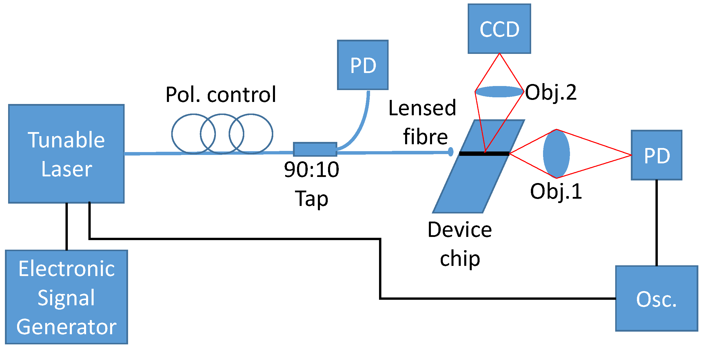 All of the measurements presented in this work were carried out using an end-fire setup as shown in Figure 3. Light from a tunable laser, Agilent 81640A (Keysight Technologies Deutschland GmbH, Böblingen, Germany), was coupled onto the silicon chip via polarization control optics and a lensed optical fibre. The top scattering from the chip was measured using a compact InGaAs camera (Xenics nv, Leuven, Belgium), and the output facet was imaged onto a photo-detector via a microscope objective (Comer optics, Linton, UK). Transmission spectra were measured by using the tunable laser in swept mode and measuring the time dependent detected power on the oscilloscope (Keysight Technologies Deutschland GmbH, Böblingen, Germany).