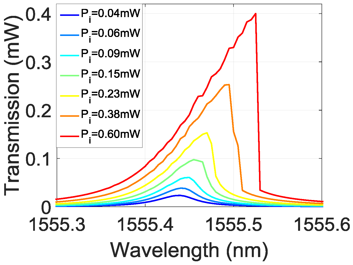 The relative position of the laser injection wavelength and cavity resonance can be controlled using the local thermal heater detailed above. This scheme makes the device robust to changes in either the laser wavelength or global thermal shifts of the cavity resonance position. In order to avoid dithering of the cavity resonance that will push the device out of the resonant operation window, this method makes use of the known spectral transfer function of the device. By measuring the cold cavity spectrum, the linear losses, resonator Q-factor and lineshape, and central resonant wavelength can be measured. Given the thermal refractive index coefficient of silicon, along with the absorption in the resonator and thermal dissipation, the transfer function can be calculated as a function of injection power [7]. Figure 4 shows simulated transmission spectra of a -phase shifted grating with the parameters matching the fabricated device with injection power as parameter. The simulation was carried out using a transfer matrix method (TMM) solution to the coupled mode equations [19], where the refractive index is a function of the power in the resonator mode volume. In this work injection power refers to the optical power in the access waveguide coupled to the resonator, and transmission refers to the power in the post-resonator waveguide. The characteristic asymmetric resonance shape is visible with injection powers as low as mW.