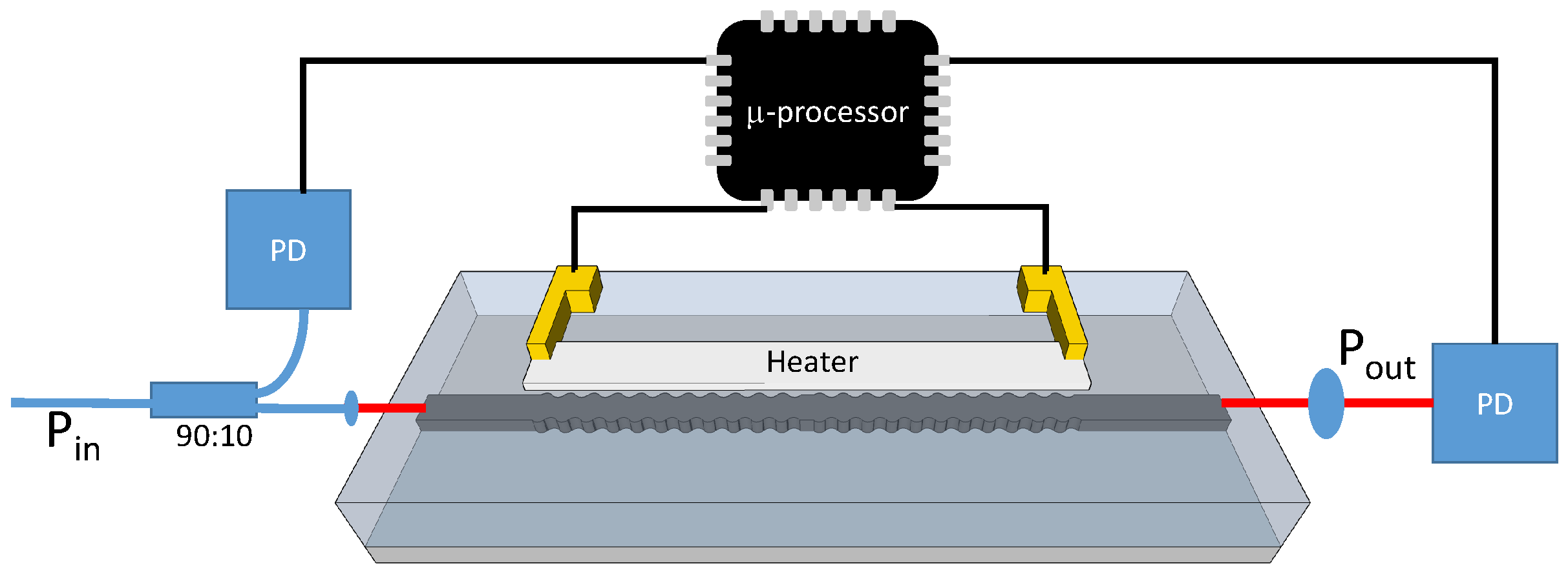 A schematic of the stabilization arrangement is presented in Figure 5. Given the transfer function of the resonator and a measurement of the input power, the resonator response can be easily calculated using the simple TMM model, which can be stored in a microprocessor controller. To stabilize the device the user sets the device manually to the optimal working point then initiates the feedback control system. If the relative position of the resonator and laser injection wavelength changes this will create an error signal dependent on the shift away from the calculated operating point and the spectral model. This error signal can then be fed-back to the local thermal heating element to shift the position of the resonant line. Any injection power changes are captured by the power tap at the input of the system.