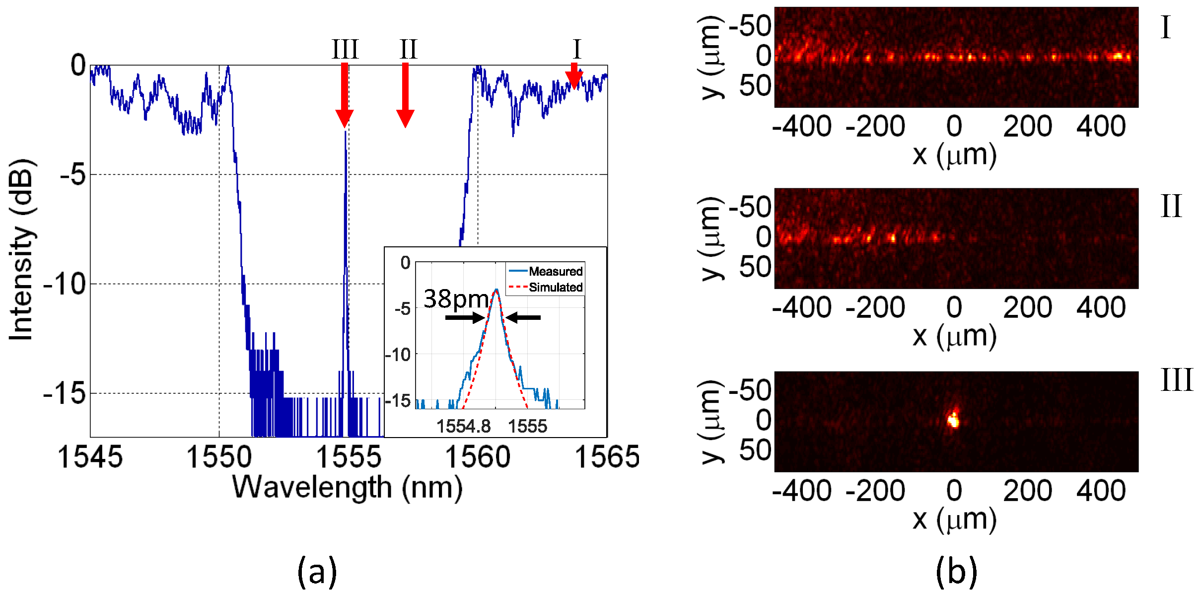 Figure 6a shows the measured transmission spectrum of the -phase shifted grating device, with a low injection power to avoid non-linear effects. The inset shows an enlargement of the resonance mode, with a Q-factor of ≈40 k. Figure 6b shows near-infrared (NIR) camera images of the light scattered vertically from the grating filter and access waveguides, where light is injected from the left hand side of the images. These images were taken before fabrication of the metal heater elements. (I) is the out of band transmission, showing scattering along the waveguide length; (II) is the in-band rejection showing little light transmitted from the input to the output waveguide; and (III) is the on-resonance transmission mode showing clear localization to the centre of the grating device.