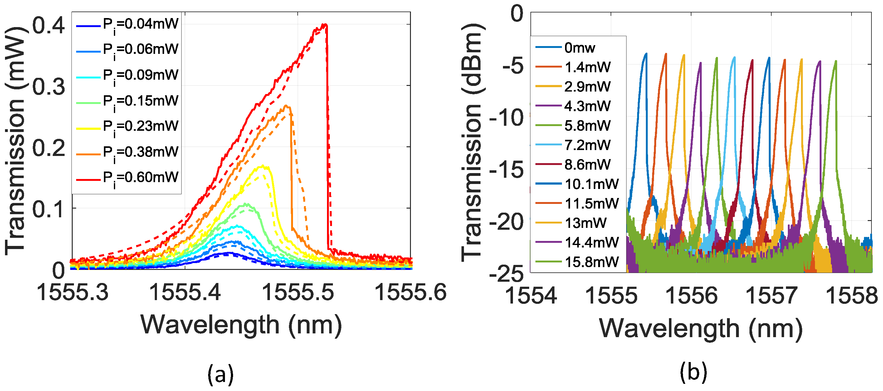 Figure 7a presents the measured transmission spectra of the device as a function of input power, along with the simulated spectra from Figure 4. The onset of the thermal non-linear behaviour is clear at around mW of power on-chip. Figure 7b shows the tuning effect of the on-chip thermal heating element. By increasing the the power dissipated on the heater the global spectrum of the device can be shifted to longer wavelengths, whilst still retaining the non-linear thermal resonance shift as a function of injected optical power.