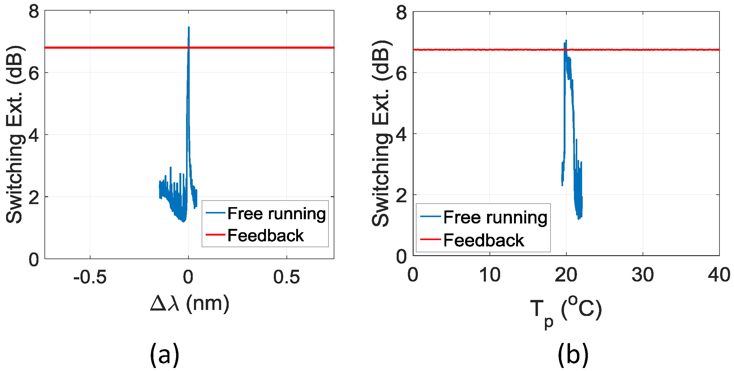 As mentioned previously, the device was mounted on a Peltier control stage in a thermally controlled laboratory environment. Nevertheless, in the free running case, after initializing the system at its optimal working point, the lifetime of operation was in the order of minutes. When the feedback system was enabled there was no observed drift in measured extinction ratio of the bistable switching over an 8 h period of operation. The system was then forced by detuning the laser injection wavelength from the optimal working point in both positive and negative directions from the set-point. Figure 10a shows the switching extinction ratio as a measure of operation in the bistable regime for laser detuning wavelength. Behaviour of the system is shown for both the free running case and where the feedback system has been engaged. For the case with no feedback control the bistable switching exists over only a few picometres of laser detuning as expected. When the control loop is engaged the laser wavelength can be detuned over a nm range without affecting the bistable switching operation, limited only by the resistive heater’s operation range.
