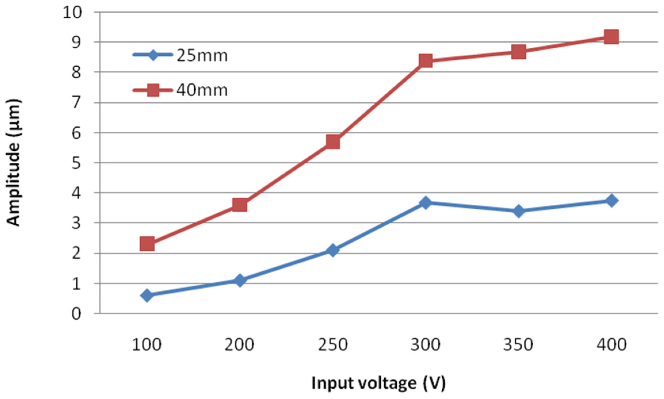 Variation in amplitude with input voltage for cutter stretch length of 25 and 40 mm.