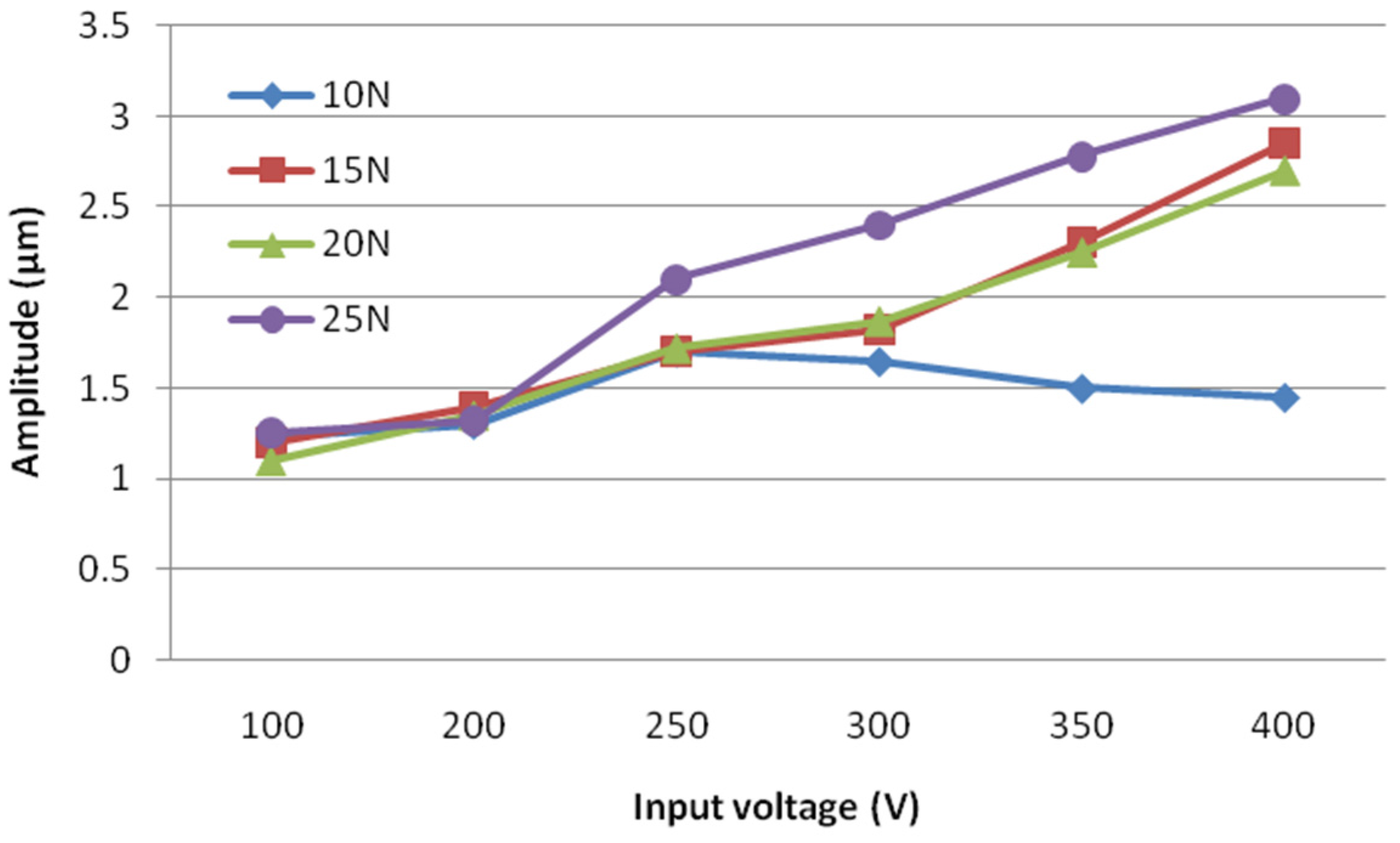 Variation in amplitude with input voltage for cutter holding force of 10, 15, 20 and 25 N.