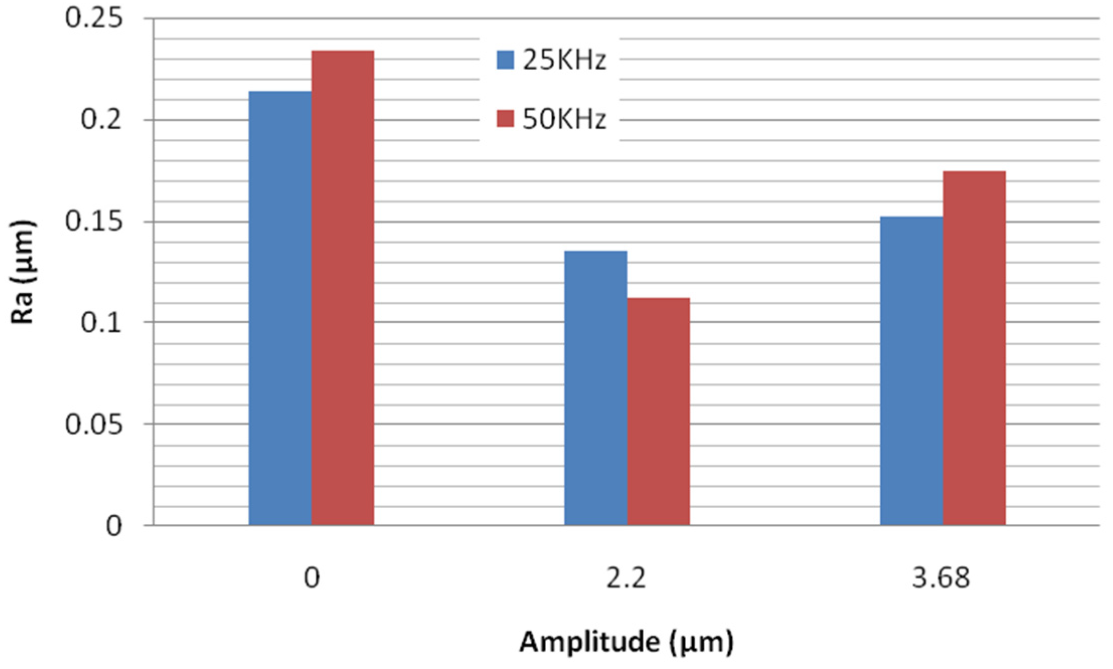 Figure 5 shows the variation in surface roughness (Ra) of the workpiece for unassisted milling and ultrasonic-assisted milling (amplitude of 2.20 and 3.68 μm) at two different frequencies (20 and 50 kHz). The purpose of the experiment was an evaluation of the effect of ultrasonically assisted milling and whether it improved the roughness of the machined surface or not. Three samples were processed using the same machining parameters, and the surface roughness was assessed as an average of the roughness of the three. For unassisted milling, the Ra value was approximately 0.236 μm. For assisted milling at an ultrasonic amplitude of 2.20 µm, the Ra values were 0.136 and 0.110 μm at 20 and 50 kHz, respectively. At an amplitude of 3.68 µm, Ra values were 0.151 and 0.174 µm at 20 and 50 kHz, respectively. It is clear from these Ra figures that a better finish can be achieved with ultrasonic-assisted milling. It also became clear that there is an optimal value for the amplitude of the ultrasonic vibration used which will give the best finish under the conditions of these experiments. This is believed to be a result of the “hammer effect” induced by ultrasonic vibration. Because of the high-frequency vibration, the cutter teeth will hammer the workpiece constantly. This means the quality of the processed surface can be improved by the choice of an appropriate ultrasonic amplitude. Simply raising the amplitude does not work because the ideal amplitude depends on other cutting conditions such a feed, depth of cut and so on. This finding agrees with that of Lian et al. [4].