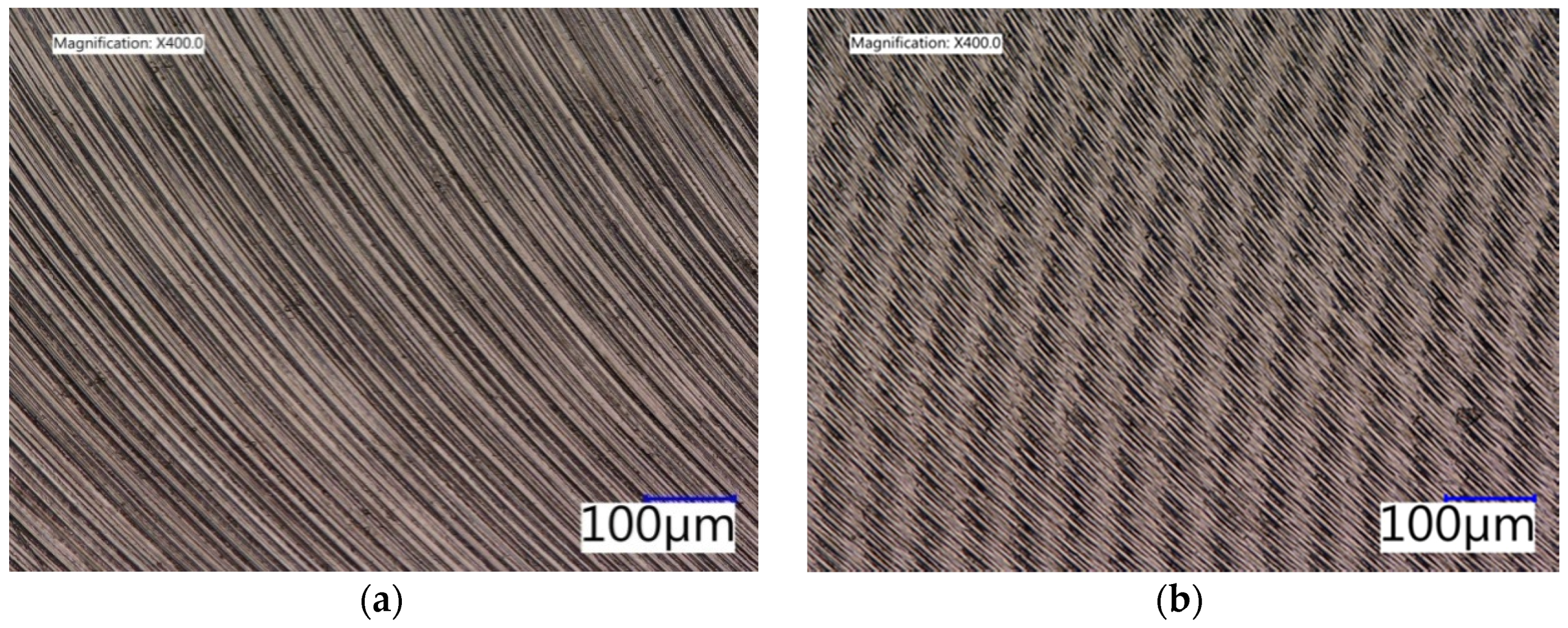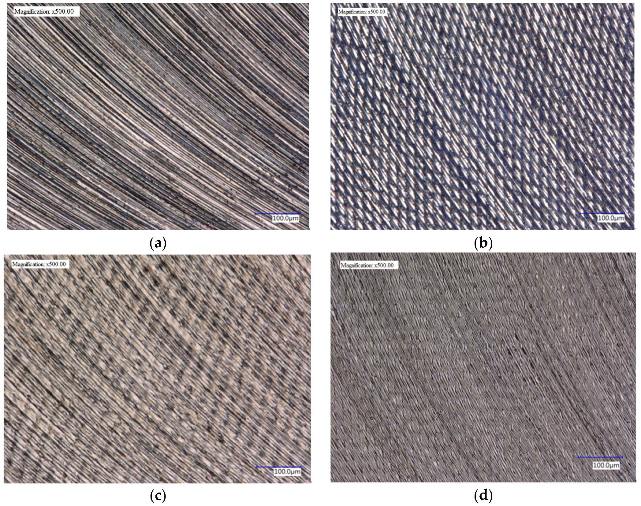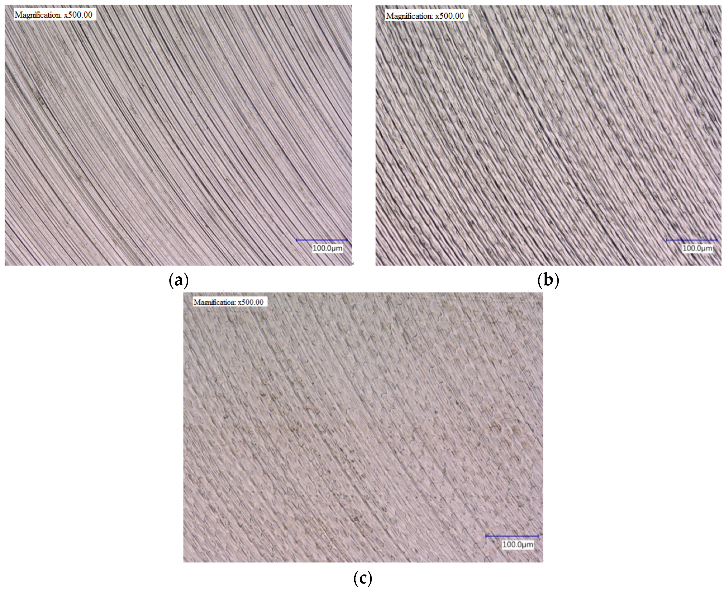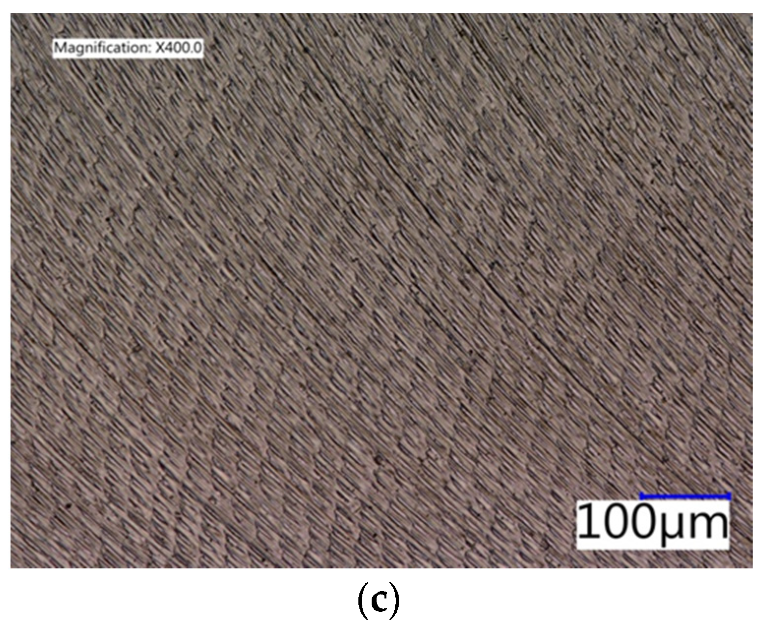 Figure 6 shows optical micrographs (400×) of the surface of a sample machined by unassisted milling, compared to that of samples milled with ultrasonic assistance at frequencies of 20 and 50 kHz. In Figure 6a there are prominent machining marks on the Stavax (modified AISI 420) sample surface. In Figure 6b,c the machining marks are less evident and there are dark lines present associated with ultrasonic assistance. The surfaces were also much finer and more uniform than that processed by unassisted milling.