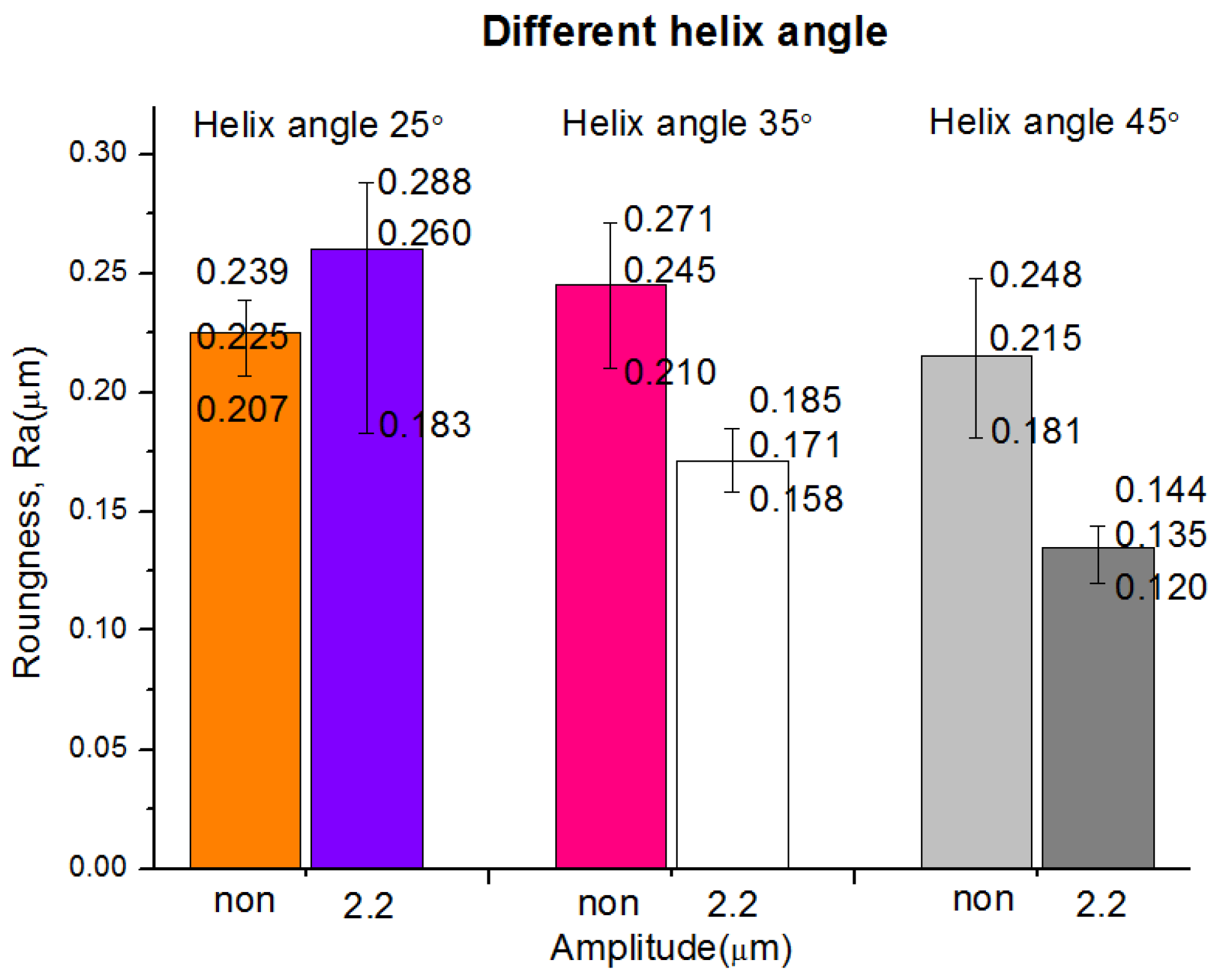 Variations in the average surface roughness (Ra) of Stavax (modified AISI 420) milled with and without ultrasonic vibration using cutters with a helix angle of 25°, 35° and 45°.