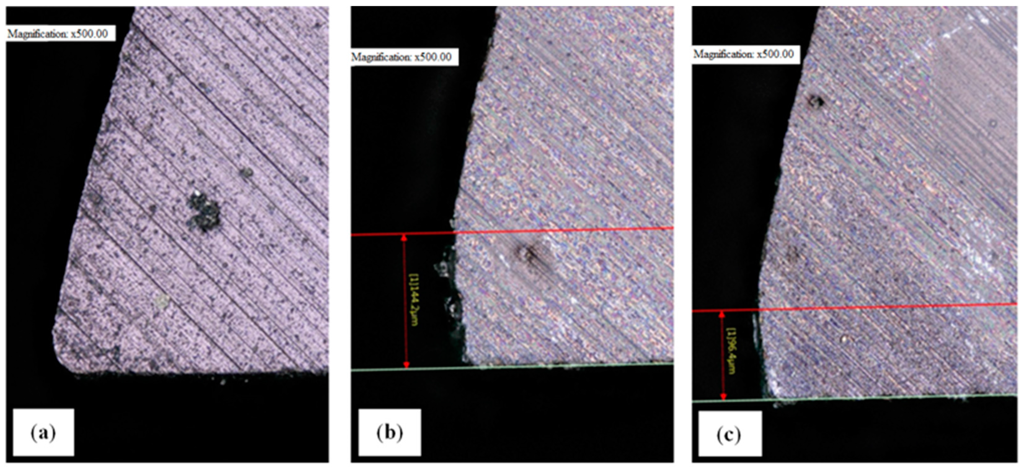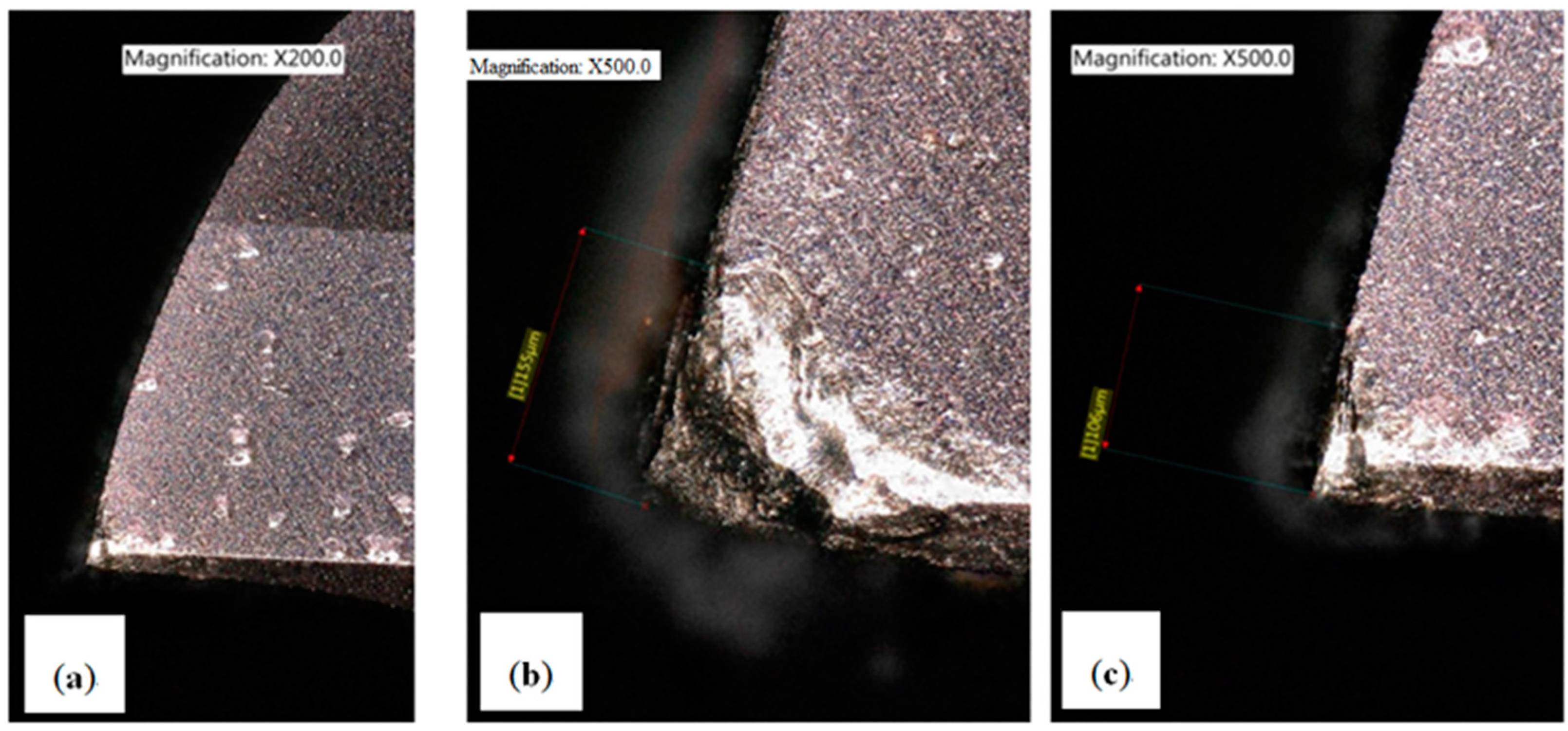 Tool wear is a most important parameter that must be taken into account with respect to the accuracy of a machined component. Accuracy is also reflected by the degree to which the machined surface corresponds to that of the cutting tool with which it was in contact during the process. Optical micrographs of the cutting edges of tools with helix angles of 25°, 35° and 45°, used with and without ultrasonics, are shown in Figure 9, Figure 10 and Figure 11. It was found that tool wear with ultrasonic vibration was less than in conventional milling due to the axial movement of the cutter which periodically increases the gap between the tool and the workpiece which promotes interfacial lubrication. This is similar to the findings of Manjot et al. [14] and Geng et al. [15]. The conclusion is that tools used in ultrasonic-assisted machining last longer.