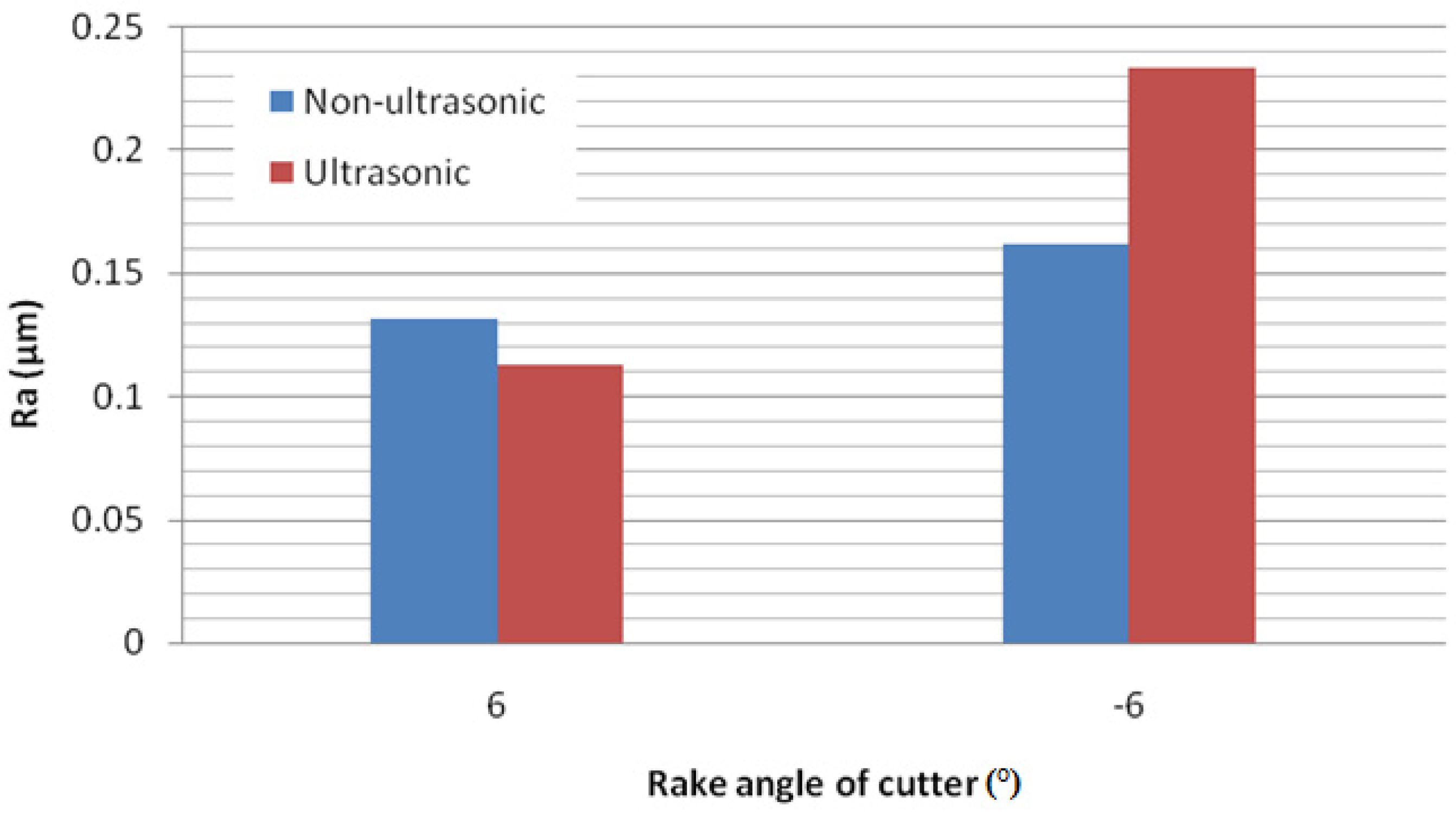 Variation in the average surface roughness (Ra) of Stavax (modified AISI 420) machined with and without ultrasonics at cutter rake angles of 6° and −6°.