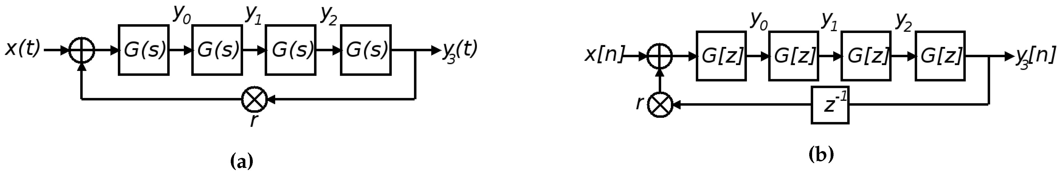 Continuous-time (a) and discrete time (b) block diagrams of the Moog ladder filter after Stilson and Smith, 1996 [1].