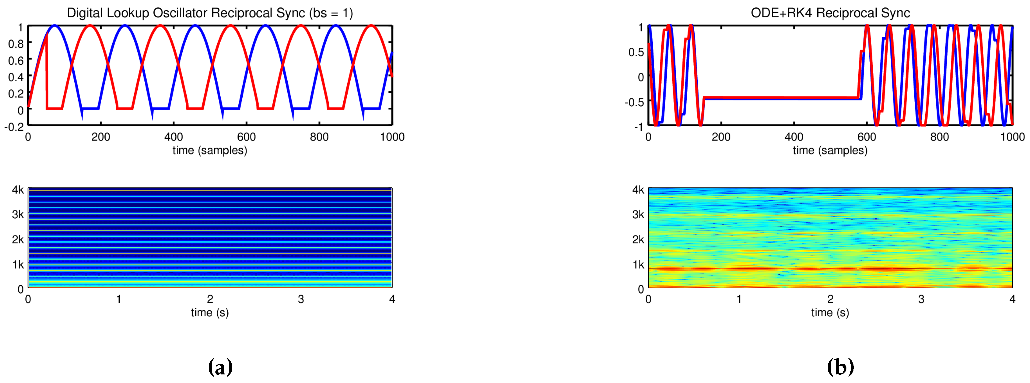 The output of (a) two digital lookup oscillators in a tight sync loop and (b) another pair given Equations (16) and (17) fed to the fourth order Runge-Kutta (RK4) method for solution. (a) 950 Hz and 900 Hz digital lookup oscillators in reciprocal sync. ; (b) The same parameters but using the dynamical model in Equations (16) and (17).