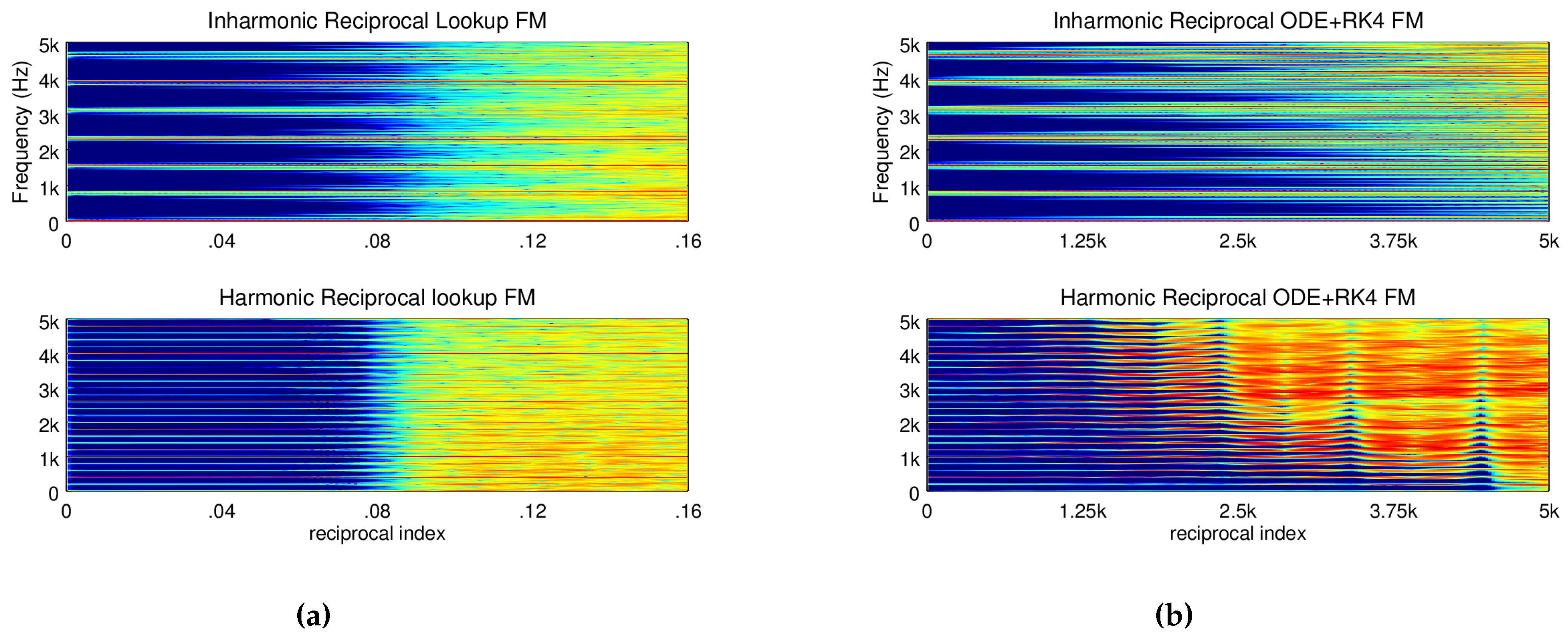 Spectrograms of (a) reciprocal frequency modulation using lookup oscillators of frequencies 800 Hz and 777 Hz in the top and 800 Hz and 600 Hz in the bottom; In (b) the same network with the same frequencies, but using the ODE (ordinary differential equation) + RK4 implementation. In all four plots the modulation index of the 800 Hz oscillator is held fixed while the other modulation index is swept upwards