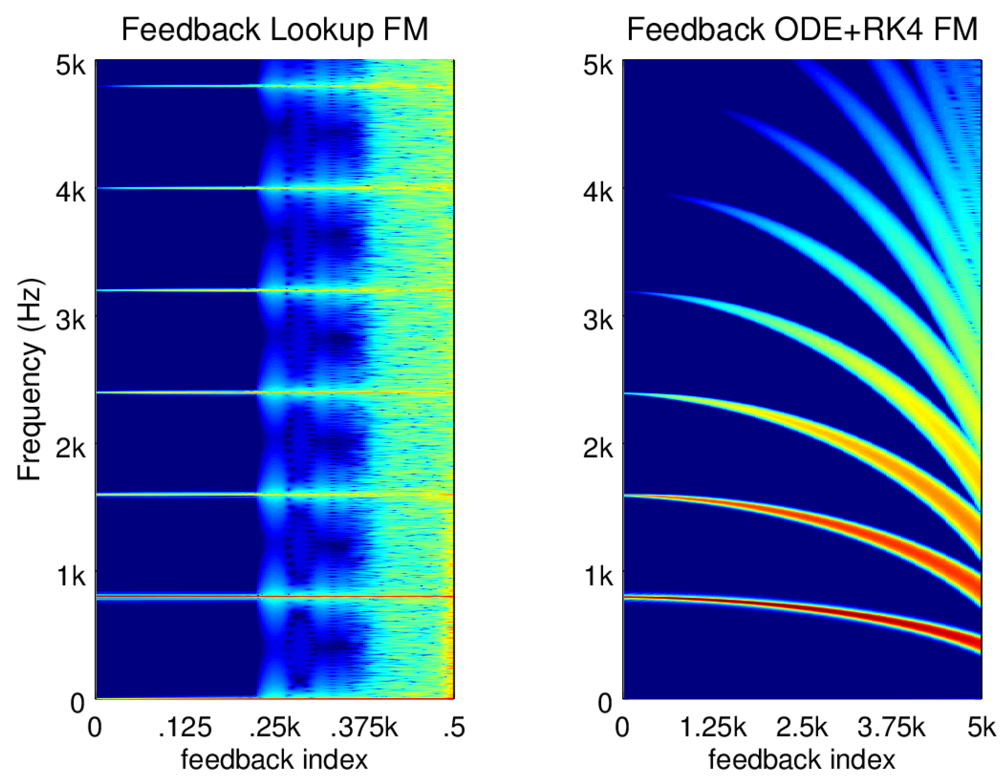 As a final note, feedback FM (FBFM) has been known for some time [26]. FBFM differs from reciprocal FM in that FBFM needs only one lookup oscillator whose delayed output modulates its own phase input signal. As in the case with reciprocal FM, FBFM will cause a great deal of aliasing and foldover at higher indices and this comes across as broadband noise (Figure 6). In the ODE + RK4 implementation of FBFM we instead see that higher modulation indices bring about a flattening effect along with increased harmonic energy.