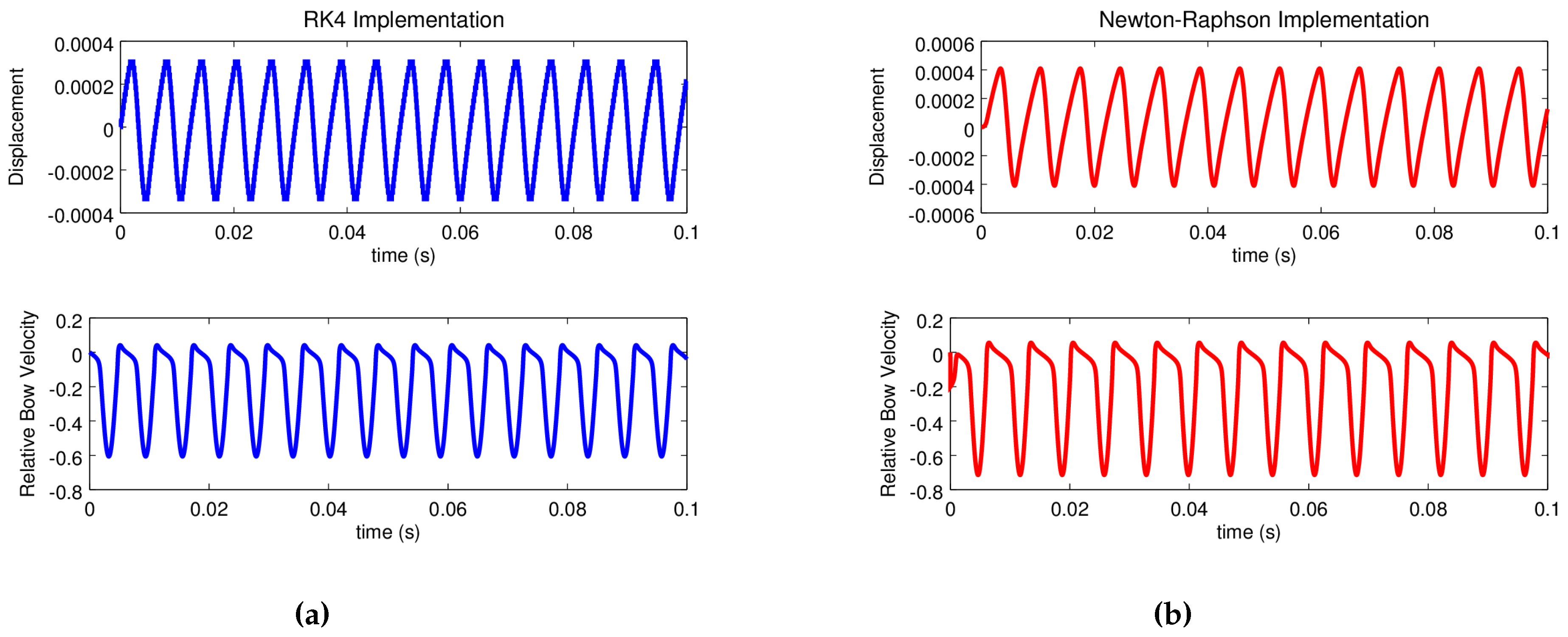 The time-step h used here is simply the inverse of the sampling frequency: for most of the examples shown below. RK4 is chosen because it is explicit, commonly used, and fourth order accurate. It is beyond the scope of this paper to describe the accuracy and numerical stability of RK4 and compare it to other, similar solvers. The curious reader may be referred to chapter 3 in [16] for a thorough investigation of this topic as it pertains to audio synthesis. It is worth noting, however, that RK4 does not always guarantee stability.
