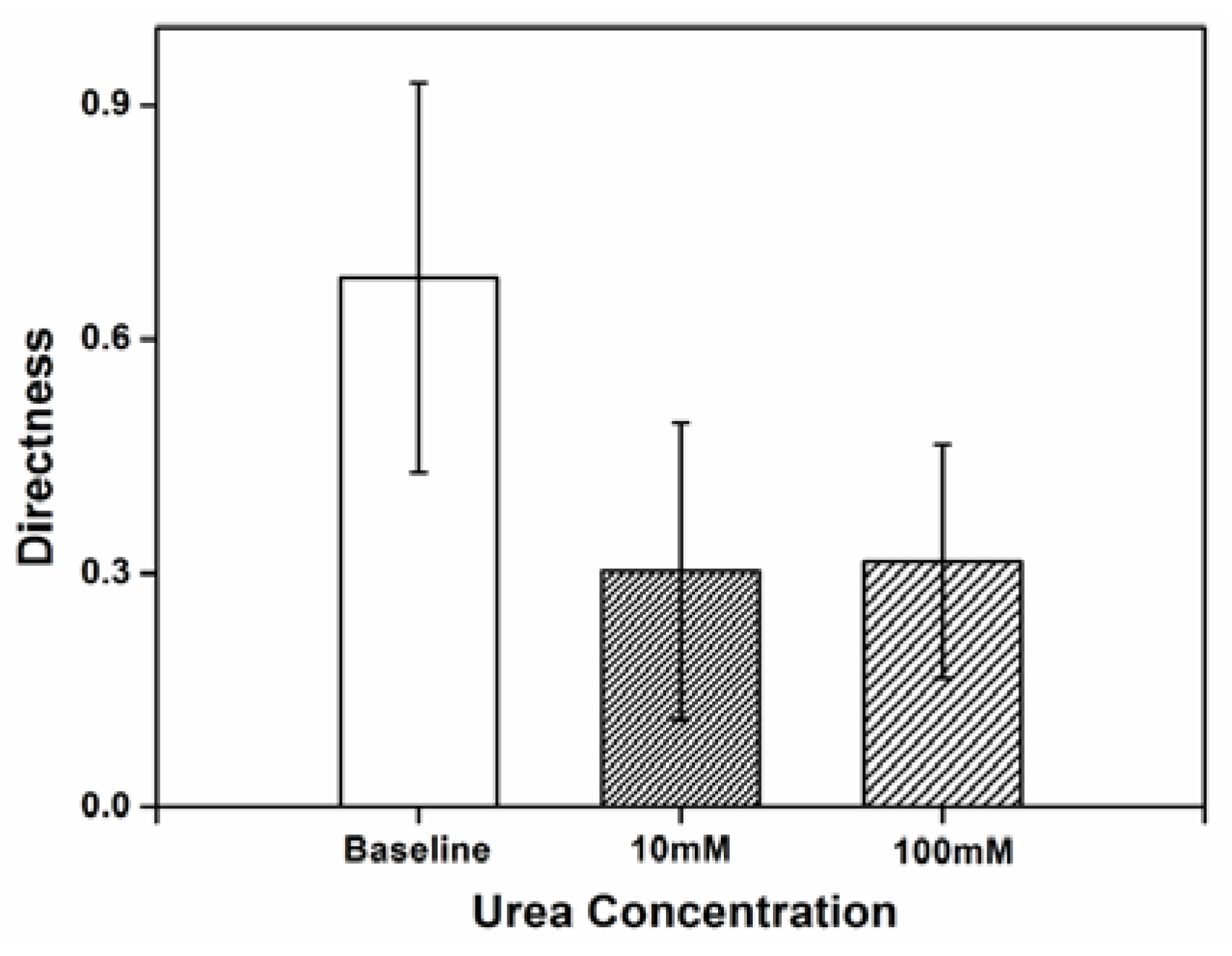 Directness of the H. pylori in chemotaxis buffer with 10 and 100 mM of urea within the microfluidic device. A steep decrease was observed in the directness when urea solution was introduced, while no significant differences were observed between 10 and 100 mM urea-exposed cells. Three independent tests were conducted and 20–30 bacteria in each test were randomly selected for tracking and analyzing in each test.