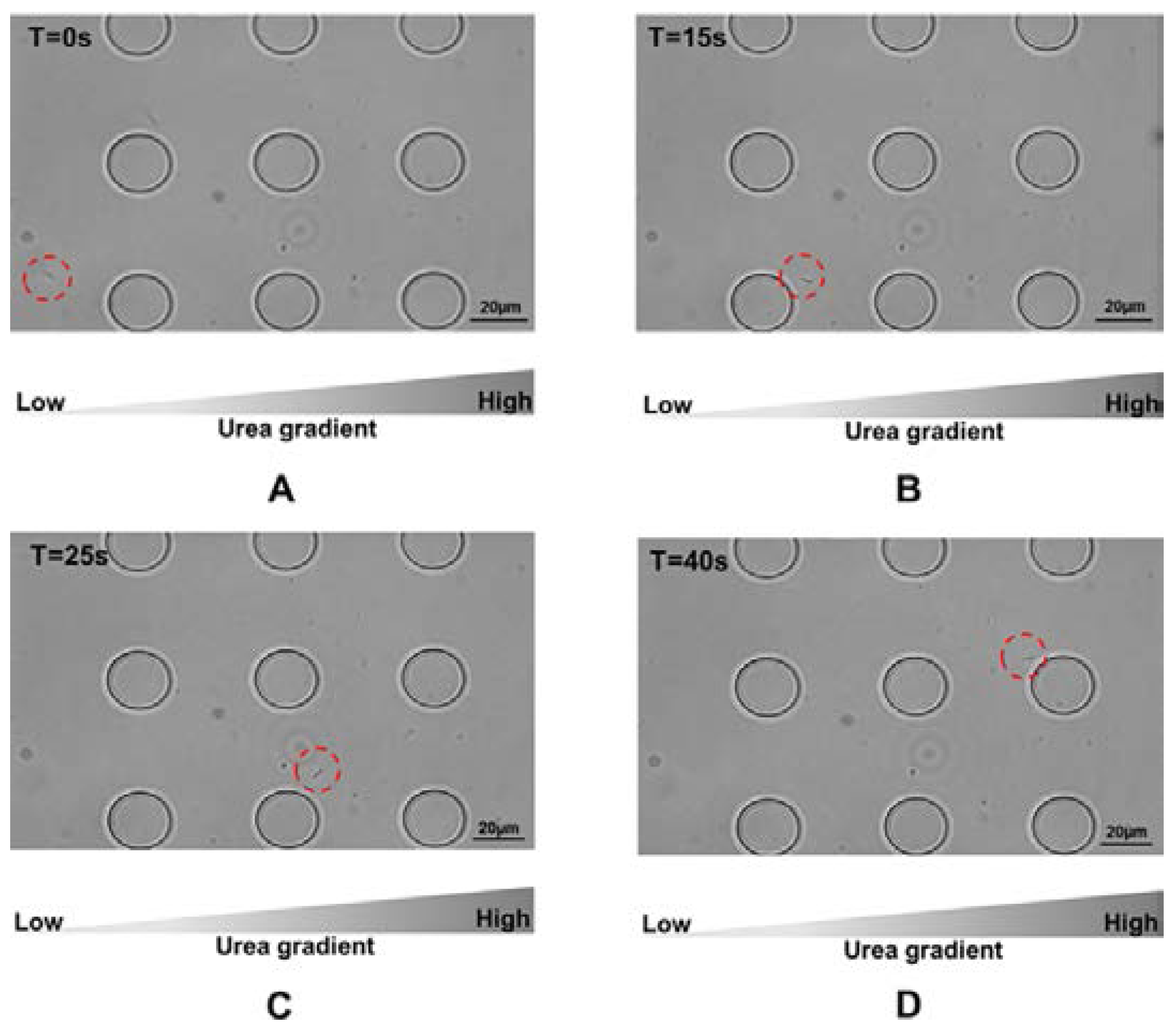 Time-lapse migration image of an H. pylori cell response to a gradient concentration of urea solution within the microfluidic device (a low to high concentration gradient of urea was generated within the microfluidic device along the left hand side to the right). Red circles labeled in the picture indicates the tracked cell’s location at the time points of (A) 0 s; (B) 15 s; (C) 25 s; and (D) 40 s, respectively.
