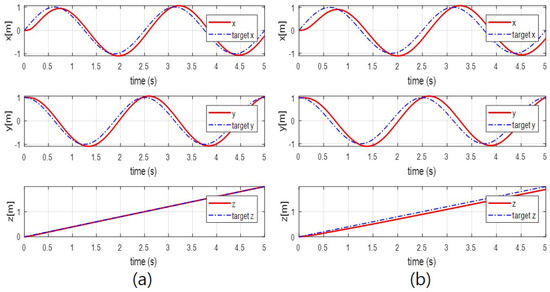 The trajectory tracking control results for each of the three axes. The dashed line indicates the reference trajectory of each axis, and the solid line is the result of the simulation about each axis: (a) x; (b) y; (c) z.