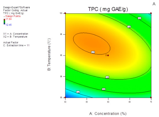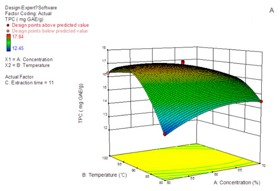 In addition, Figure 2B and Figure 3B reveal the effect of extraction time and temperature on the TPC. When the concentration of extraction solvent was zero, both the mutual interaction and quadratic effects of extraction time and temperature on the TPC extraction were exhibited. Maintaining the extraction temperature at 80 °C and increasing extraction time from 9 to 11 min raised the TPC value dramatically and then kept it steadily saturating. Besides, as the extraction time was kept at 9 min, the TPC value increased sharply, followed by the temperature increase from 80 to 90 °C similarly to finding in Figure 2B and Figure 3B.
