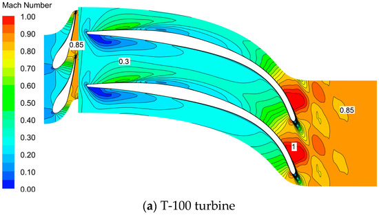 Figure 12 shows the comparison of Mach number contour between T-100 turbine and T-100re turbine at the mid-span section under design condition. At the outlet of the nozzle, the Mach number of T-100 turbine is lower than that of the T-100re turbine, while it is adverse at the outlet of the rotor. It is indicated that the enthalpy drop of T-100re turbine in the nozzle and the rotor is redistributed well, and the range of the lower Mach number in the rotor passage is reduced because of its higher rotational speed and reasonable rotor geometry. In addition, the absolute outlet velocity of T-100re turbine is 216.38 m/s, lower than that of T-100 turbine, 185.14m/s; thus, the total-to-static efficiency of the turbine is improved.