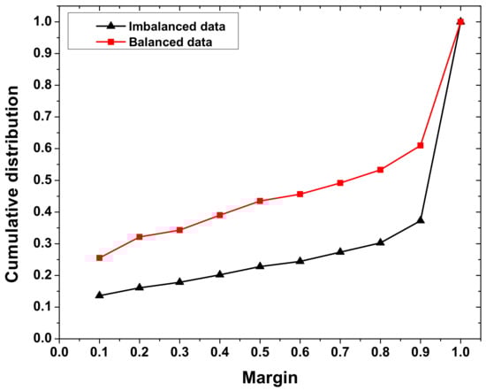 The margin distribution of training instances effectively reflects the performance of an ensemble algorithm. In this section, we analyze the effect of class imbalance on the margin distribution of the training set. During the process of classifying a balanced multi-class data, each class has the same number of instances. However, class imbalance makes the learning task more complex. Figure 1 shows the margin distribution of correctly classified training instances by bagging involving decision tree as base learner on data set Vehicle (Table 1) in both balanced and imbalanced cases, using our ensemble margin Equation (4). The margin values should be as high as possible for correctly classified instances. From the margin plot, we can see that imbalanced data lead to more instances of obtaining high margin values and less instances with low margin values. In fact, the existence of one or more minority classes in a classification task results in majority classes obtaining more space. Thus causes a classifier bias to the classification of majority classes and an illusory optimized margin distribution for imbalance learning.